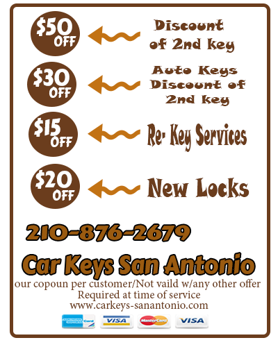 Do you need new car keys made for your vehicle right at your location in San Antonio Texas? Do you need any transponder, chip, smart, or remotes programmed for your auto keys? Did you get locked out of your car near the Alamo? Well, if so Car Keys San Antonio, is the best locksmith company choice for you. Our mobile locksmith company is open 24-Hours every single day helping you serve any of your lock or key needs and concerns in only minutes right at your exact location anywhere in the city, using the most professional and up to date methods and techniques to provide you with quick and affordable auto mobile locksmith service all the time.